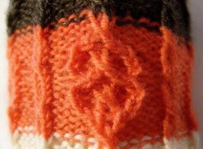 Basically a layered shot cocktail comprising of coffee liqueur, Irish cream, and an orange liqueur, this little devil should, when prepared properly, separate into 3 distinct layers. The B-52 sock has layers, too – 3 cabled layers of stylised coffee beans, irish knots and orange segments running in neatly worked stripes from a toe-up cast-on, up the foot and onto the leg, with an afterthought heel and round toe.