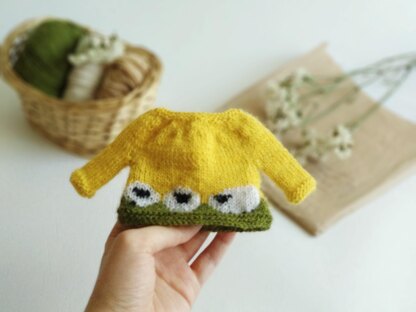 The mini sweater pattern is written in detail but you must be familiar with basic knit stitches and techniques such as: cast on/cast off; how to make knit and purl stitches, KKL (knit left loop increase); know the method magic loop / in the round; worked ‘back and forth’ on 2 knitting needles