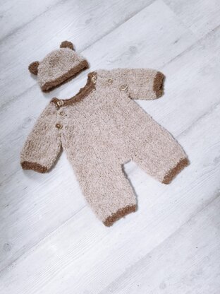 This cute, unisex, snuggly and soft all-in-one romper is worked in a boucle Aran (Worsted) weight yarn to give a bear like feel. Worked bottom up, mostly in stocking stitch with 1x1 rib hems and cuffs. The romper has openings at the raglan sleeves which gives a generous amount of space for changing baby. The garment is oversized so it can be worn over other items of lightweight clothing. The romper comes with cute matching hat which is worked in 2 pieces so the ears can be attached in seams.