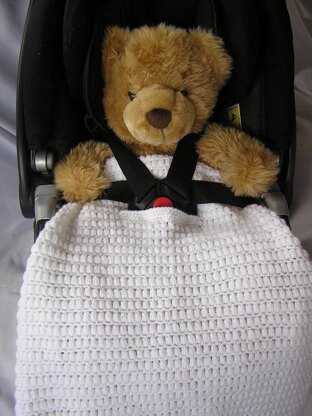 The blanket is made in one piece, then surrounded by a border it is one of the easiest but entrancing patterns to crochet. It is reversible and has a press-stud opening to accommodate car seat belts and harnesses.