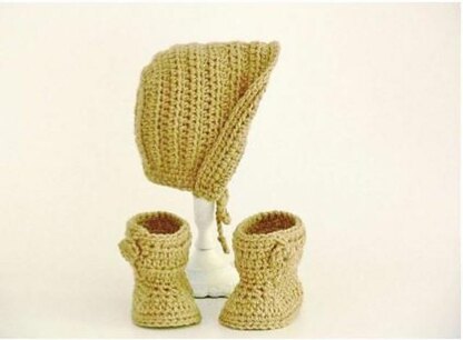 Easy Crochet Pattern for a Baby Bonnet and Booties for boy or girl. Pull out the brim to protect against suns rays or raindrops. Very sweet set for baby.
