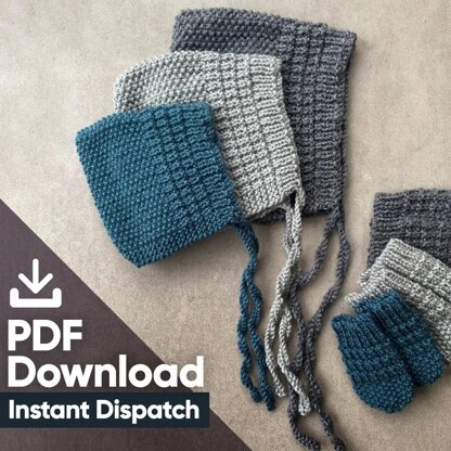 There are three sizes within this pattern; newborn, 3-6m and 6-12m. To complete this project you will need 3.5mm and 4mm needles. To knit a bonnet and mittens set in aged 6-12m will approximately use 75 grams of double knit baby yarn. This listing is for a printed paper copy of the hurdle and moss baby bonnet and mittens set, which is a written pattern and not a chart.
