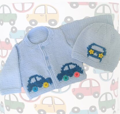 Knitting pattern for a cute car jacket and hat. Quick to knit and makes a lovely baby shower gift for a newborn or for toddlers up to the age of 18 months.