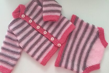 I used James C. Brett Magi-Knit baby dk for this cute little set, It does knit up nice using lots of different colours for each band making it ideal for using up some of your half balls of yarn.