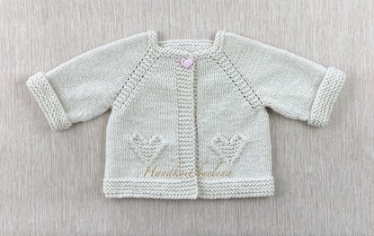 The pattern includes both written instructions and a chart for the heart motifs that are knitted top-down. It also includes a schematic for the cardigan.