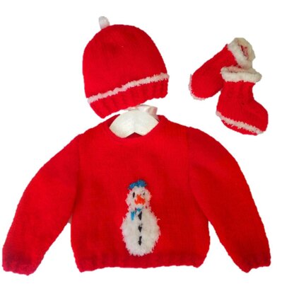 Knitting Pattern for a cute Christmas Sweater, Hat and Bootees Set featuring a fluffy snowman for ages 0-18 months