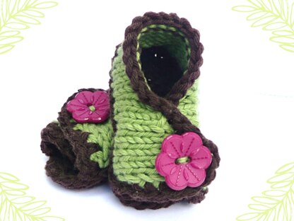 This is a follow up to my Crossover Shoes pattern but especially for showing of tootsies in the summer. It features a special seamless sole construction using a seamless cast on and Magic Loop knitting. If you have not tried these techniques, it is a great small scale project to practise something new. No need to worry about buttonholes either, as these are fastened with snap fasteners and buttons are purely decorative. An original design for summer and perfect for baby shower gifts too!
