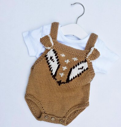 Our cute, DK weight romper has a sweet fawn face worked into the front section. The romper is worked mostly in stocking stitch with a garter stitch hem and a 4 stitch border at each side. It is worked flat, in 2 pieces: front and back. The back has a G St waistband that extends round to the front to fasten with buttons on each side and straps fasten at front with buttons that are hidden behind the ears.