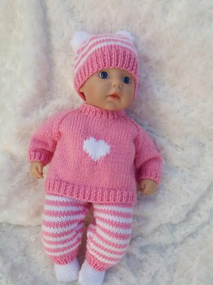 Here's a cute little outfit in two sizes to fit a 12" and 14" baby doll, which includes sweater with heart motif, leggings, hat with 2 small pompoms and socks.