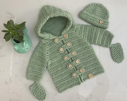 The Baby Duffle Coat is a timeless and classic design. Worked from the top down in DK weight yarn, the main jacket is complemented with a rolled brim beanie and mitts on a string!
