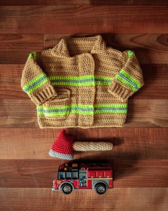 Dress your little firefighter this fall in his or her very own firefighter's jacket! Adorable lightweight sweater designed to look like a fireman's jacket along with an axe-shaped rattle. Both patterns included. Pattern includes newborn to 3 month, 6-9 month and 12-18 month sizes. Crocheted in sport yarn for a lightweight sweater, perfect for cool summer/fall evenings.