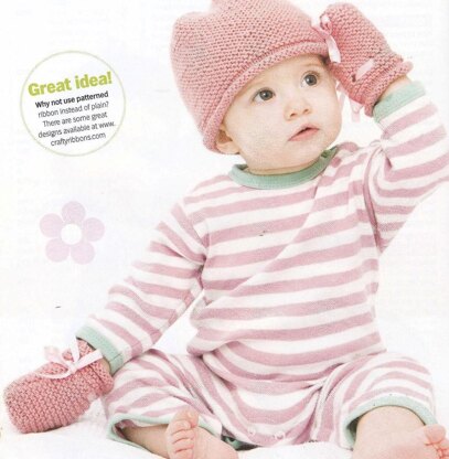 This is a pattern for a Garter Stitch Hat and Mittens, originally published in Knit Today with issue 70. The hat is a simple shape with stocking stitch edge and garter stitch main, decorated with a ribbon. The mittens are simple in garter stitch with a stocking stitch border, with eyelets and a ribbon to fasten. Photos Knit Today.