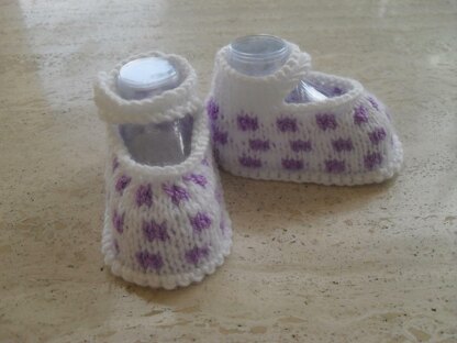 Adorable Spotty Baby Girl Shoes - This Pattern Makes Three Sizes Of Shoes 0 to 3, 3 to 6 and 6 to 9 Months. They are make in one piece working from the sole upwards using Dk. On Two Needles.