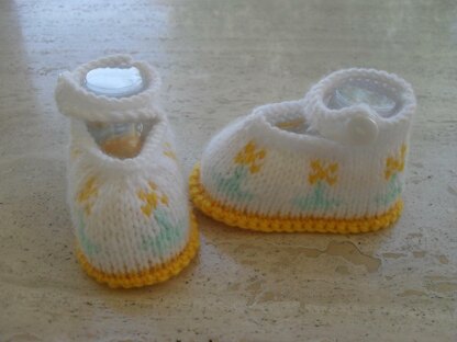 Really Cute Baby Girl Shoe Flower Pattern. These Shoes are made in one piece using two needles working from the sole of the foot upwards . This Pattern Makes Three Sizes of Shoes 0 to 3, 3 to 6 and 6 to 9 Months. Quick and Easy.