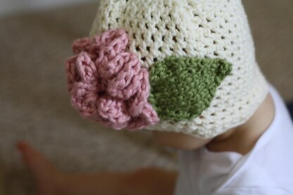 Listing is for a pattern to make your own hand crocheted Cream hat with a pink accent flower and green leaf.