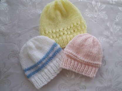Baby Hat Trio - straight needles DK knitting pattern premature early small baby newborn-3 months