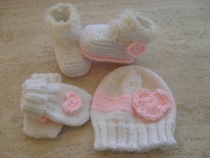 Baby Girl Knitting Pattern Makes Beanie Booties And Mittens, Please note the Hearts Are Crochet. This Pattern Is Quick And Easy Made In Garter Stitch And Stocking Stitch. Payment By Paypal.