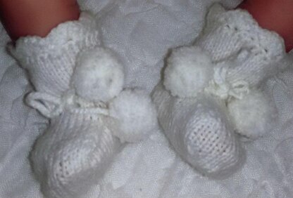 Lovely booties with pom poms and shell edging and a cute bonnet with shell edging