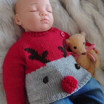 Baby Rudolf is the perfect Christmas sweater for a baby. It is knitted in 2 colours with the reindeer’s face added afterwards.