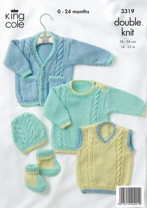 Baby Sweater, Tank Top, Cardigan, Boots and Hat in King Cole Bamboo Cotton DK - 3319 is a Knitting pattern by King Cole, available as a Leaflet and includes instructions in English. Super fun to make, this pattern could be your next masterpiece!