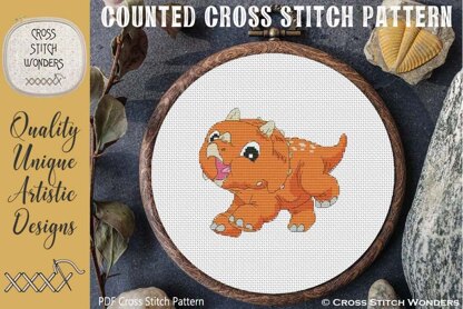 An adorable Baby Triceratops Design.\nOriginal licensed artwork by Clipartopolis.\nCross Stitch Pattern designed by Marcia Manning.\n80 stitches wide by 70 stitches high.\nPDF is a COLOR counted cross stitch chart which lists suggested DMC floss colors, and includes a color picture.\nStitched design size is as follows:\nSize 11 count: 7.27 x 6.36 inches or 18.47 x 16.16 cm\nSize 14 count: 5.71 x 5.00 inches or 14.51 x 12.70 cm\nSize 16 count: 5.00 x 4.38 inches or 12.70 x 11.11 cm\nSize 18 count: 4.44 x 3.89 inches or 11.29 x 9.88 cm\nSize 22 count: 3.64 x 3.18 inches or 9.24 x 8.08 cm