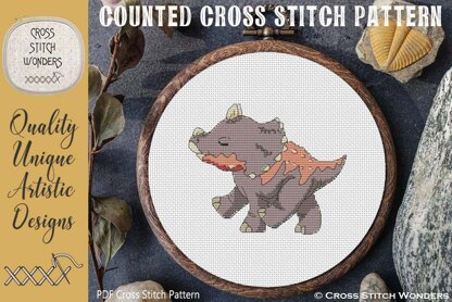 An adorable Baby Triceratops Design.\nOriginal licensed artwork by Clipartopolis.\nCross Stitch Pattern designed by Marcia Manning.\n80 stitches wide by 65 stitches high.\nPDF is a COLOR counted cross stitch chart which lists suggested DMC floss colors, and includes a color picture.\nStitched design size is as follows:\nSize 11 count: 7.27 x 5.91 inches or 18.47 x 15.01 cm\nSize 14 count: 5.71 x 4.64 inches or 14.51 x 11.79 cm\nSize 16 count: 5.00 x 4.06 inches or 12.70 x 10.32 cm\nSize 18 count: 4.44 x 3.61 inches or 11.29 x 9.17 cm\nSize 22 count: 3.64 x 2.95 inches or 9.24 x 7.50 cm