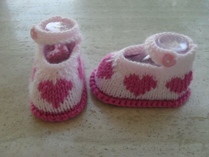 Really Cute Baby Girl Heart Shoes Made in Dk in One Piece on Two Needles This Pattern is Quick and Easy Makes Three Sizes of Shoes 0 to 3, 3 to 6 and 6 to 9 Months.