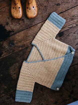 A tender wraparound baby cardigan design in 4 sizes : 0 - 3 months 3 - 6 months 6 - 12 months 12 - 24 months