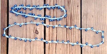What a neat idea to use up baby yarn, for something “cool” to wear at the beach! You can pair this with any outfit, but looks very good with casual and sportswear! This is a very simple design, and explains how to knit it easily, with the beads. People have told us, they love this with a swimsuit during the day, then pop a pullover on at night and wear over the pullover. You will think of other ways to wear this too. This uses up small amounts of baby yarn for necklaces in 2 sizes. In 23” and 34“ lengths, but could easily be made longer. We used knitting needles, US # 3.
