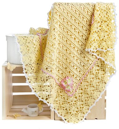 This luxurious and such delicate blanket is available in three sizes, and is made with thread (sport, dk) weight yarn. Instructions are the same for all sizes: the different yarn weights and corresponding gauges are essential in altering the size. Perfect for Easter, spring and summer days, the blanket can be embellished with different flower pins—much as baby’s breath is used to perk up bouquets of many other flowers.