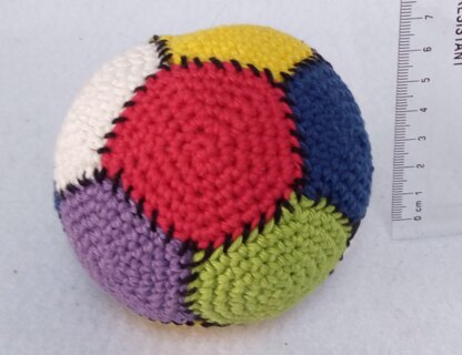This is made of pentagons, five sided shapes, 12 of them. I wanted something easy, bright and very safe for tiny babies (no eyes, and if you sew carefully no risk of stuffing coming out or parts being pulled off). It’s bright, and nice to hold. I used cotton, so it’s easy to wash, and won’t give nasty fibres if it is sucked. If you want it bigger, use aran yarn instead of dk.