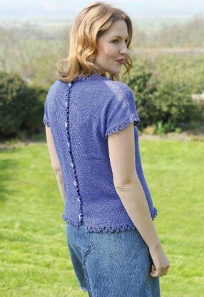 This is a patten for Back ButtonTee, originally published in Knitting Magazine. It is in stocking stitch with a button fastening at the back, lace edges and cap sleeves. Photos Knitting magazine.