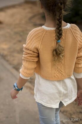 This cropped cardigan is knitted top down and absolutely seamless. It features cable panel on the back, textured sleeves and raglan cables that go all the way to the hem, creating beautiful side panels