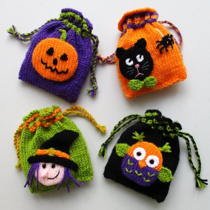 These little Trick-or-Treat drawstring bags are perfect for Halloween. Black, lime green, orange and purple make a really ‘spooky’ colour combination. The witch, black cat, spider, owl and pumpkin are all easy to make shapes that are knitted separately and stitched to the bags. Bag measures - 13cm x 11cm (5in x 4.5in).
