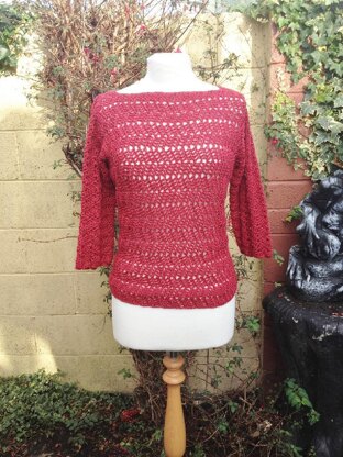 This jumper is crocheted sideways from right sleeve cuff to left sleeve cuff. The pattern is written using American crochet terms.