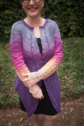 This elegant cardigan was designed to take fullest advantage of gradient-dyed, fingering-weight yarns like this one. The bottom-up, sleeves-first structure lets you use up all of the gradient yarn, using a kettle-dyed main color for the rest of the garment.
