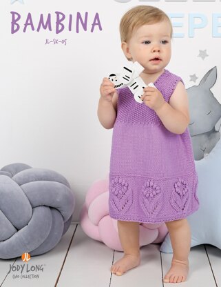 Delicate flower trimmed dress made using DK weight yarn and sized for 0-11 years.