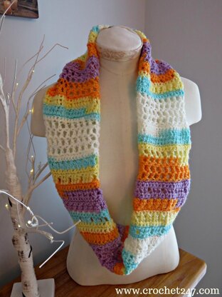 Easy and fun to make children's cowl designed with and for someone fairly new to crochet in mind - some familiar stitches - double and treble crochet - and some new stitches to practise - Bobble, X, Mesh.
