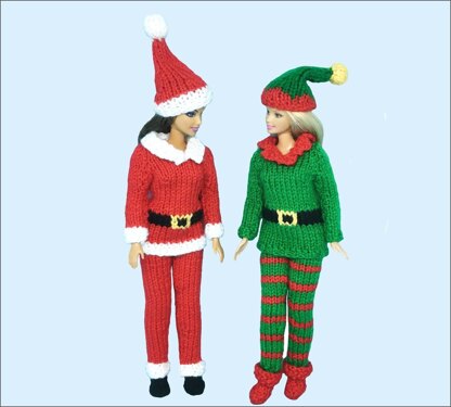 Dress your Barbie for Christmas in these easy to knit Santa and Elf outfits. Will fit most 11 - 12 inch dolls. No buttons or fastenings so they are child safe. The pattern includes the tunic, trousers, hat and boots and uses around 30g of DK yarn in various colours.