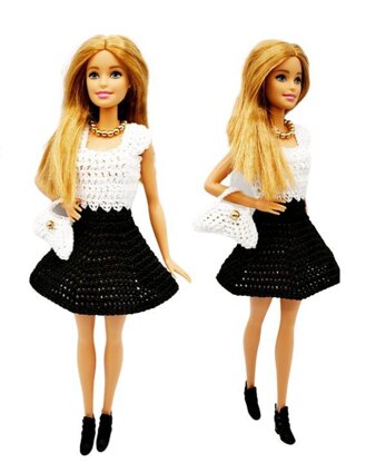 Barbie is so classic, so I decided to make her another dress, this time it’s the elegant black and white Skirt Dress. And I added a little fancy purse and necklace to complete the look! Black and white are such great contrast colors and the added golden beads make the outfit festive for any event.