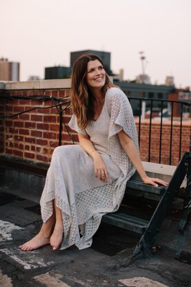 Barcarolle is a floor-length dress with a deep v-neck and I-cord edging along the neckline. The dress is worked in two pieces and seamed in from the sides, leaving side lace ruffles. Both charted and written instructions are included for the lace pattern.