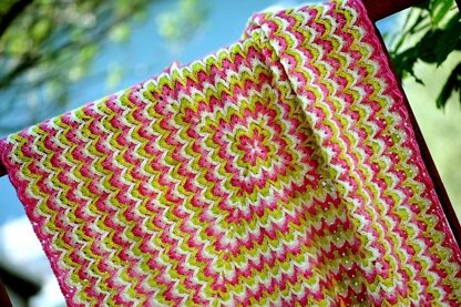 The blanket can be crocheted as a single motif to create a simple and quick baby gift. Smaller motifs can also be turned into coasters, potholders, pillow covers, or chair cushions. For a larger-size afghan, several motifs are joined together. This is a great project to use all those leftovers and create something bright and cheerful.