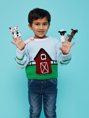 The Barnyard Pals sweater is sized to fit approx. ages 2-11 year and comes complete with patterns for the Chicken, Cow, Pig, Sheep and Horse finger puppets.