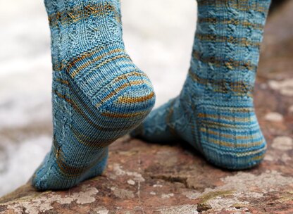 This sock was designed for the Sheepy Time Knits Hobbit Club, based on the chapter “Barrels Out of Bond”. The sock features a gently waving travelling stitch to mimic the current of the Forest River, and a unique barrel-patterned heel.