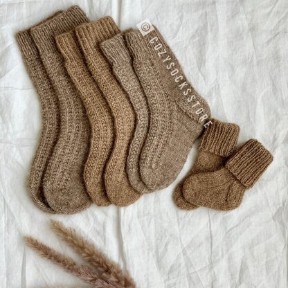 Pattern in English, US knitting terms Skills: knit, purl I used circular needles 80 cm long. But you can easily adapt it to set 4 Double Pointed Needles Pattern include with more yarn suggestions. You can use any yarn close to parameters. The pattern includes step-by-step instructions, video tutorials for each step, and a ribbed pattern chart. This pattern includes video demonstration of the pattern. There are no spoken words in the video, and the directions are all shown in captions. The pattern includes four sizes (Baby 3-12 months; Childrens 5-10 years; Womens 6-9 US shoes sizes; Men's 9-12 US shoes sizes. All sizes and the number of skeins are written in the table with measurements of ankle, foot. Easy to adjust foot length to fit your size.