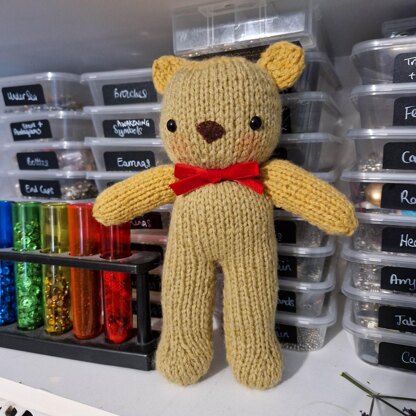 This is a very easy-to-follow knitting pattern for a cuddly bear. It's a good size as a carry-along companion for a child or a great shelf piece as it stands well. Easy pattern to follow. I use double-knit acrylic wool. Size 10* needles, and this toy measures 9.5 Inches tall