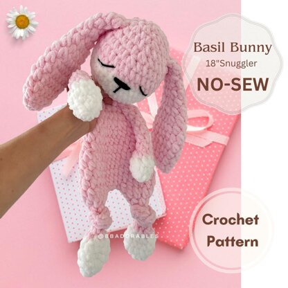 Basil Bunny Snuggler // Crochet Pattern Only He measures approx. 18 inches (46cm), final measures will vary, depends on the yarn you use. You will need: ⭐ 7.00 mm crochet hook ⭐ Super Bulky Yarn (6) ⭐ Tapestry needle ⭐ Stuffing ⭐ Stitch marker ⭐ Pins ⭐ Scissors © 2023 BBadorables - All rights reserved. This pattern is for personal use only. This pattern or parts of it must not be reproduced or published (printed or online), altered, resold or used for commercial purposes. You can sell items made from this pattern, provided that they are handmade by yourself in a limited number and you give credit to me as the designer. Thank you!