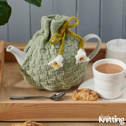 This is a pattern for a basket stitch and snowdrops tea cosy, originally published in Simply Knitting. It has a simple basket stitch pattern, fine for beginners. The top has a tie with snowdrops sewn to the end. Photo Simply Knitting.