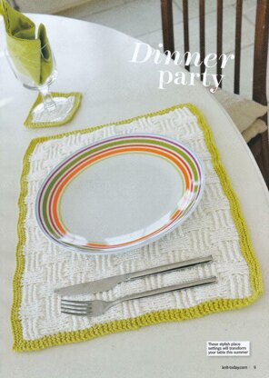 This is a pattern for a Basket Stitch Placemat and Coaster, originally published in Knit Today. The main pattern is a simple basket stitch , fine for beginners. There is a contrast garter stitch border. The yarn has now been discontinued. Any yarn knitting to the DK tension can be used. Photo Knit Today.