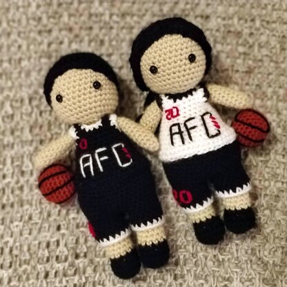 These little Basketball players have a total length of about 24 cm (using Aran weight yarn). You can easily make your own personalized player, by playing around with different colours :)
